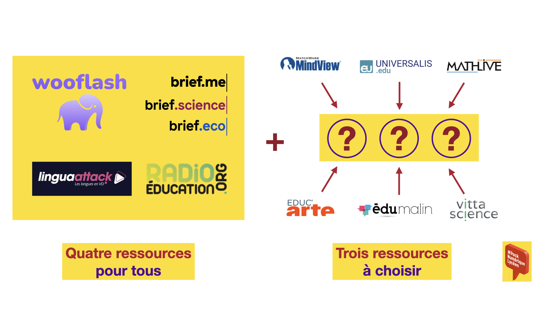 Le bouquet de ressources se compose d’une partie commune (quatre ressources offertes à tous les lycées) et d’une partie personnalisable (une à trois ressources à choisir dans une liste).