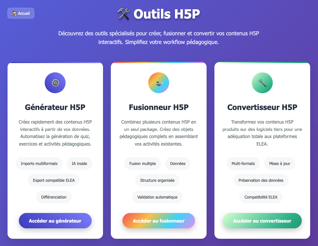 - un fusionneur de H5P, à qui l’on confie des H5P existants pour qu’il les combine et crée :