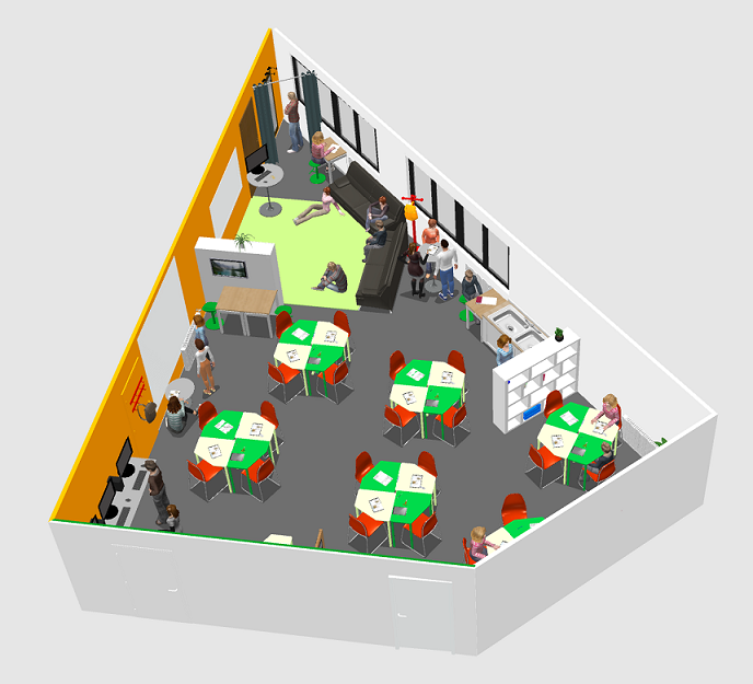 Un lieu qui permet un enseignement moins descendant, et qui est apprécié par les élèves, et vécu comme une respiration dans leur journée. Parole d’élève : « Par rapport aux salles de cours avec des rangs alignés, ici c’est plus amusant. On travaille avec du plaisir. Mais on travaille ! »