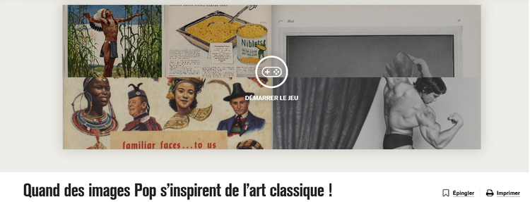 Deux parcours en EMI sont proposés autour des questions « Comment les artistes s’emparent-ils de la presse et des images ? » et « Des images pour informer ? ». - Œuvres/documents : la présentation est assez proche des parcours. L’analyse d’une image est associée à une fiche (questionnement, contenu pédagogique et des pistes pour aller plus loin).