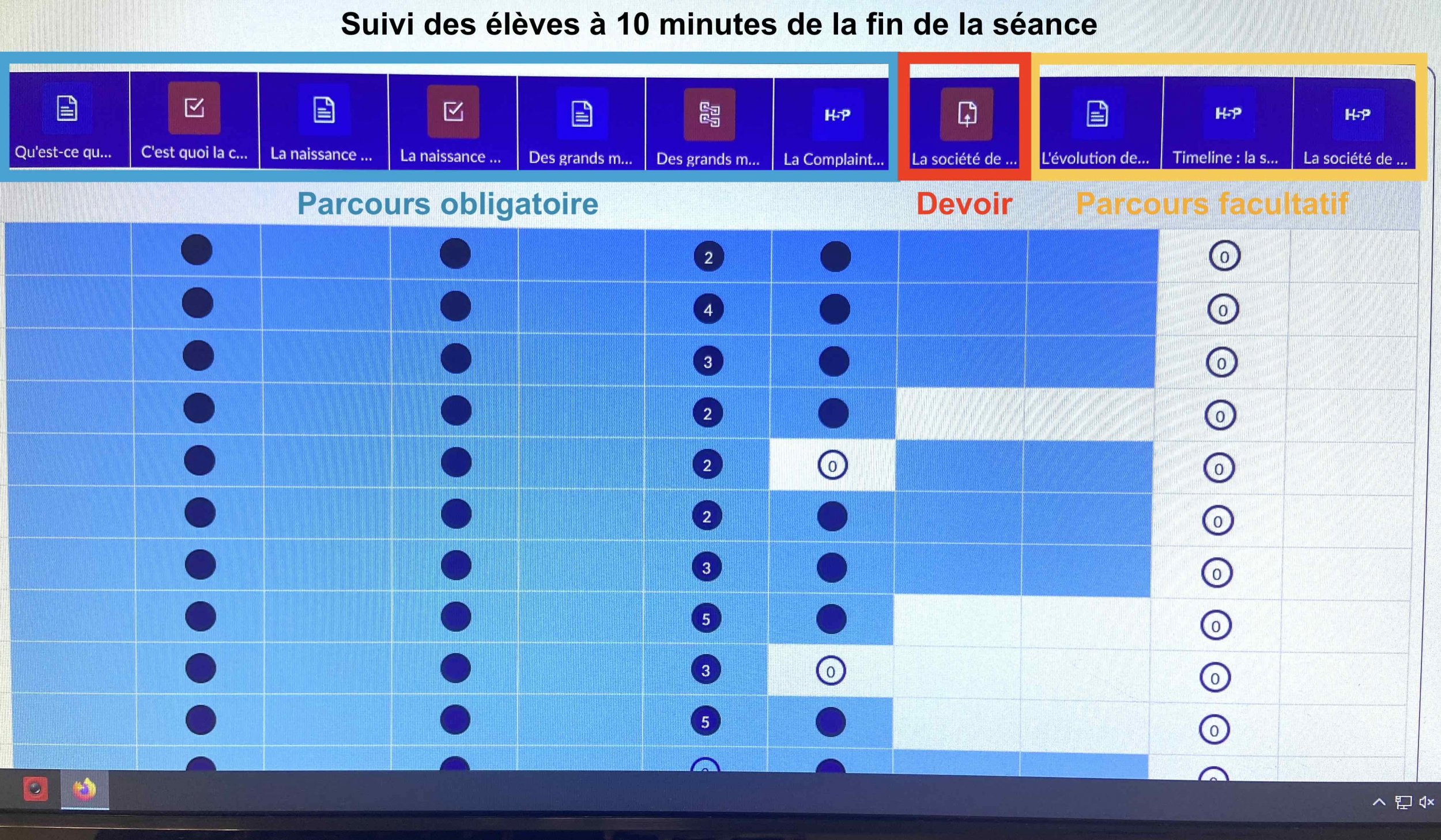 D’ailleurs, grâce à l’outil de suivi d’ELEA, il est possible de « suivre » la progression des élèves en un simple clic. Voici une capture d’écran réalisée alors que les élèves étaient en activité.