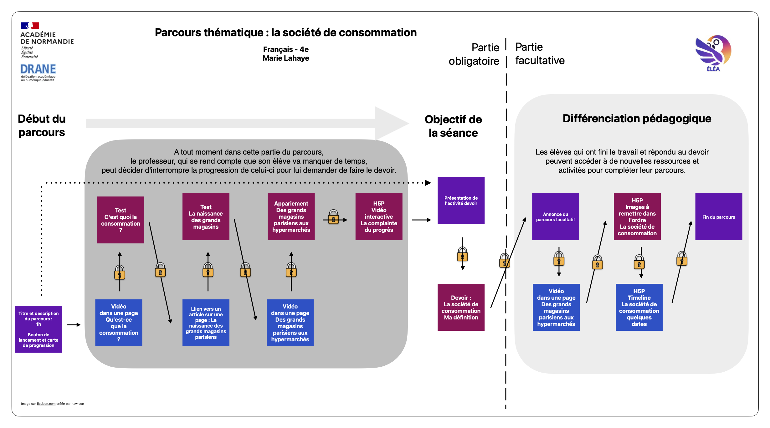 Ainsi, les éléments en violet sur le schéma ont-ils été ajoutés a posteriori afin de garantir la compréhension des tâches à effectuer par les élèves et/ou de leur indiquer où ils se trouvent dans le parcours.
